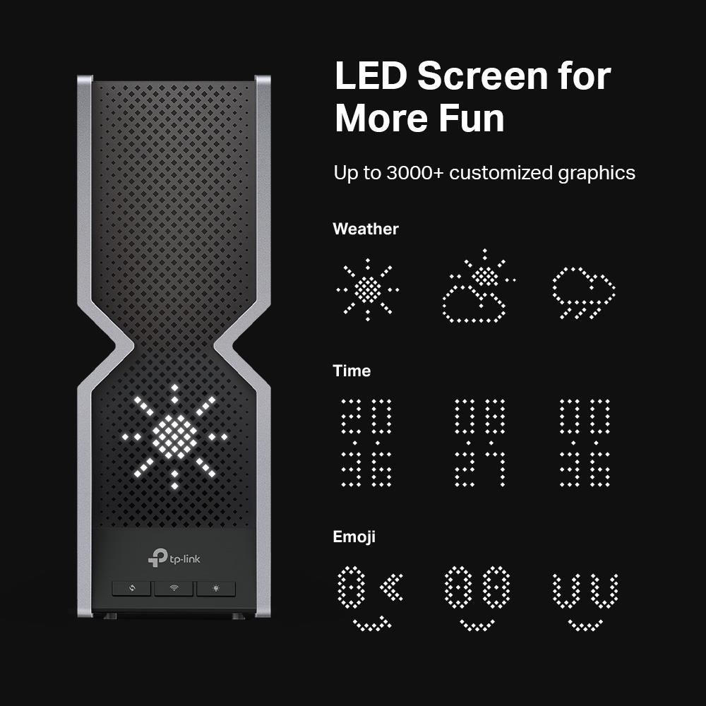 Zapomeňte na všedně vyhlížející zařízení ve vaší domácnosti. Router TP-Link Archer BE800 se umí bavit a vám to dá na odiv integrovaným LED displejem, na kterém si snadno lze zobrazit momentální předpověď počasí, přesný čas, či dokonce váš počítačový prostor odlehčit některým ze zábavných emotikonů. Navíc je zde možnost dalšího přizpůsobení s více jak 3 000 specifickými grafickými prvky.