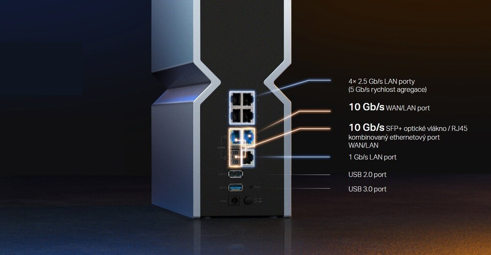 Pro bezproblémové možnosti používání je router vybaven tím nejlepším, co v současnosti můžete dostat. Tělo routeru obsahuje dvojici 10 Gb/s portů s jedním speciálním portem SFT+, čtveřici 2,5Gb/s portů a v neposlední řadě také USB 3.0 a USB 2.0.
