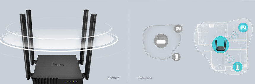 Zapomeňte na mrtvé zóny. Díky 4 diagonálně umístěným anténám pokryje Archer C54 více směrů a vytvoří široké pokrytí stabilní Wi-Fi sítí v celé domácnosti. Dejte sbohem pomalému načítání stránek a zdlouhavému stahování svého oblíbeného obsahu. Technologie Beamforming zjišťuje, kde jsou vaše bezdrátová zařízení připojena a nasměruje k nim silný signál, i když jsou daleko od routeru.