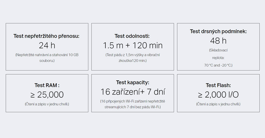 Několik opakujících se testování zajistí spolehlivost i v náročných prostředích. Test odolnosti, náročných podmínek i nepřetržitého přenosu zajistí, že stabilita routeru bude dlouhodobě vynikající.