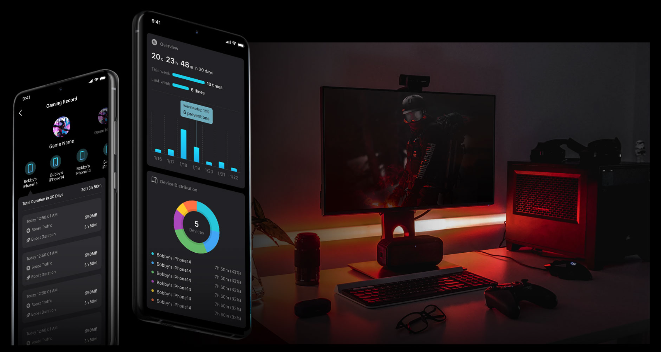 Přehled a lepší kontrolu nad svou herní sítí získáte díky speciálnímu hernímu panelu. Zobrazit si můžete provoz za různá období, včetně zařízení a aplikací. Navíc s mobilní aplikaci Tether můžete spravovat svou síť z jakéhokoliv Android nebo iOS zařízení. Využít můžete i přehledné webové rozhraní, kde lze sledovat stav sítě, výkon routeru TP-Link Archer GE800, nastavení RGB a mnoho dalšího.