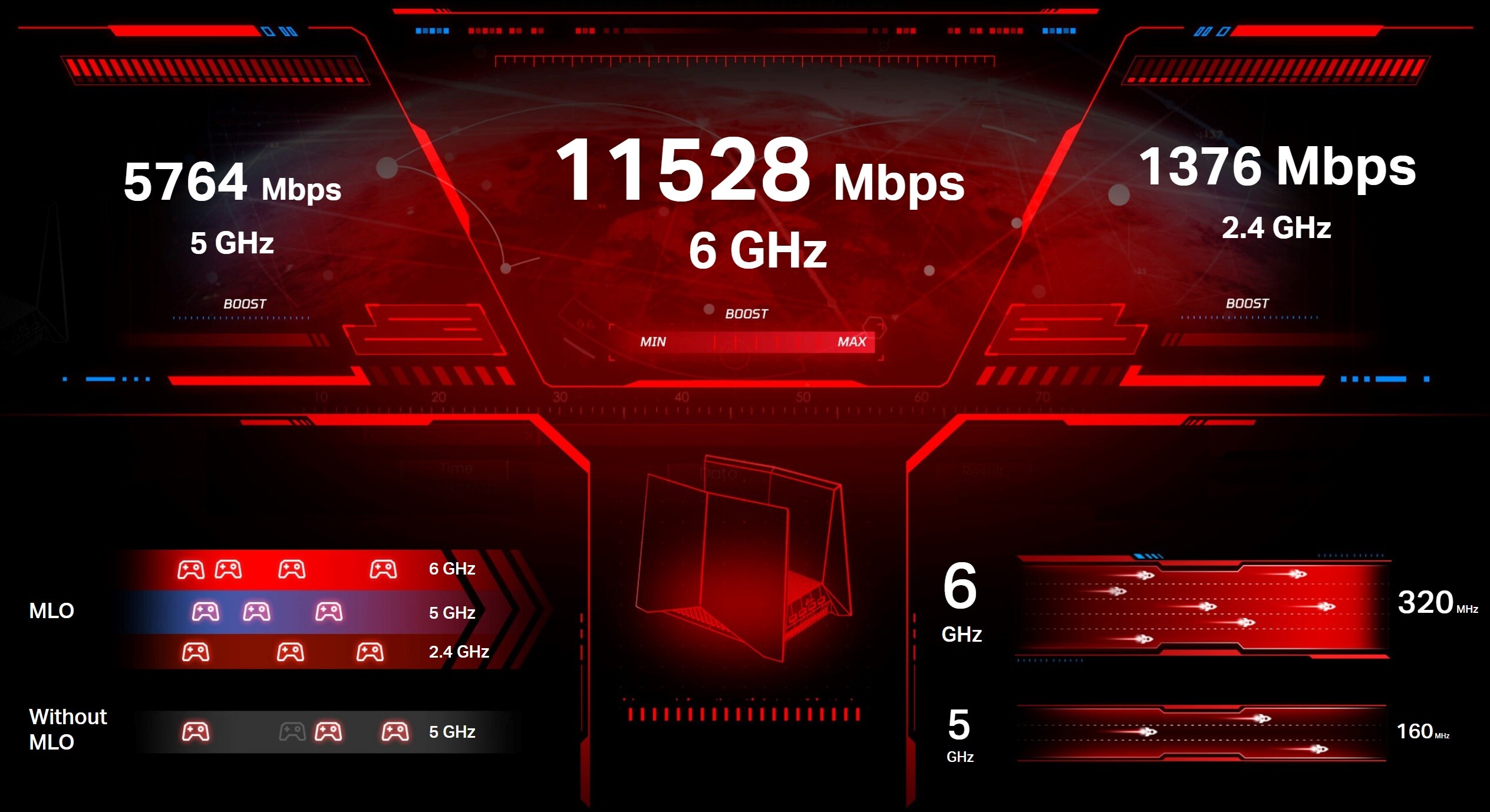 Herní router TP-Link Archer GE800 nabízí neuvěřitelnou rychlost až 19 Gb/s: s 11 520 Mb/s v pásmu 6 GHz, 5 760 Mb/s v pásmu 5 GHz a 1 376 Mb/s v pásmu 2,4 GHz – ideální pro hraní her. Disponuje dvěma 10G porty WAN/LAN a čtyřmi 2,5G LAN porty, které poskytují obrovskou šířku pásma pro kabelová herní zařízení a ultrarychlá připojení. Pyšní se intuitivním herním panelem poskytující přehled o stavu sítě, výkonu routeru, nastavení RGB a akceleraci her v reálném čase. Design routeru v herním stylu s vícebarevným osvětlením a optimalizovaným rozložením antén zajišťuje nejen kvalitní připojení, ale také vytváří herní atmosféru. Díky TP-Link HomeShield router poskytuje kvalitní antivirovou ochranu, chrání zařízení před online hrozbami a zajišťuje bezpečnost během hraní. Potěší také kompatibilitou s EasyMesh, díky které lze snadno vytvořit Wi-Fi mesh síť po celé domácnosti s konzistentním pokrytím.