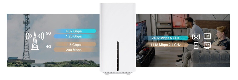 Chcete router používat na chatě nebo doma při hraní oblíbených her? Není problém. Díky jeho hybridnímu způsobu připojení si můžete vybrat mezi moderním 5G připojením s rychlostí až 4,67 Gb/s nebo klasickým LAN připojením s Wi-Fi 6. Vše je jednoduché a díky Plug & Play snadno nainstalované během několika málo minut.