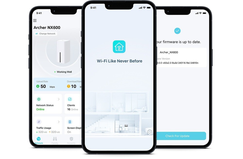 Router Archer NX600 nastavíte snadno během několika málo minut díky intuitivní a přehledné mobilní aplikaci Tether. Mimo nastavení router můžete spravovat všechny vytvořené Wi-Fi sítě, rodičovskou kontrolu a kontrolu přístupu nebo automaticky aktualizovat firmware vašeho zařízení a mít vždy aktuální výkon a zabezpečení. Aplikace je dostupná jak pro Android, tak i pro iOS.