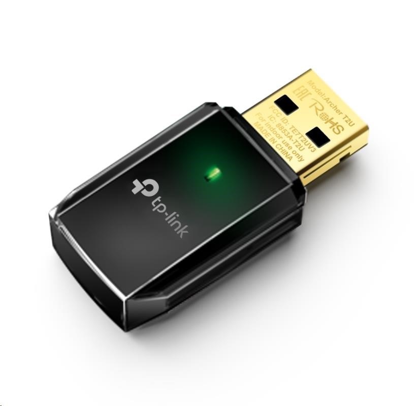 TP-Link Archer T2U WiFi5 USB adapter (AC600,2,4GHz/5GHz,USB2.0)Typ aktivního prvku:Adaptéry USB; Frekvenční pásmo (GHz):2,4, 5, 2,4 + 5 (Dual Band); Podporované standardy:802.11b/g, 802.11b/g/n, 802.11b, 802.11a, 802.11a/n, 802.11g, 802.11n, 802.11ac; Zabezpečení:WEP 64bit, WEP 128bit, WPA-PSK, WPA2-PSK; Typ antény:Integrovaná; Použití:Přenosné.