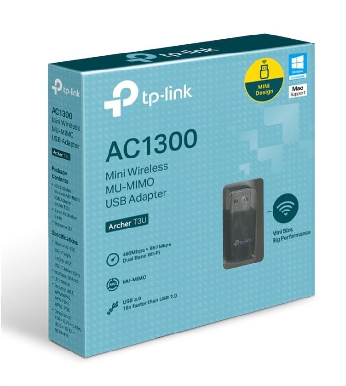 TP-Link Archer T3U WiFi5 USB adapter (AC1300,2,4GHz/5GHz,USB3.0)Typ aktivního prvku:MU-MIMO, Adaptéry USB; Frekvenční pásmo (GHz):2,4, 5, 2,4 + 5 (Dual Band); Podporované standardy:802.11b/g, 802.11b/g/n, 802.11b, 802.11a, 802.11a/n, 802.11g, 802.11n, 802.11ac; Zabezpečení:WEP 64bit, WEP 128bit, WPA, WPA2, WPA-PSK, WPA2-PSK; Typ antény:Integrovaná; Použití:Přenosné.