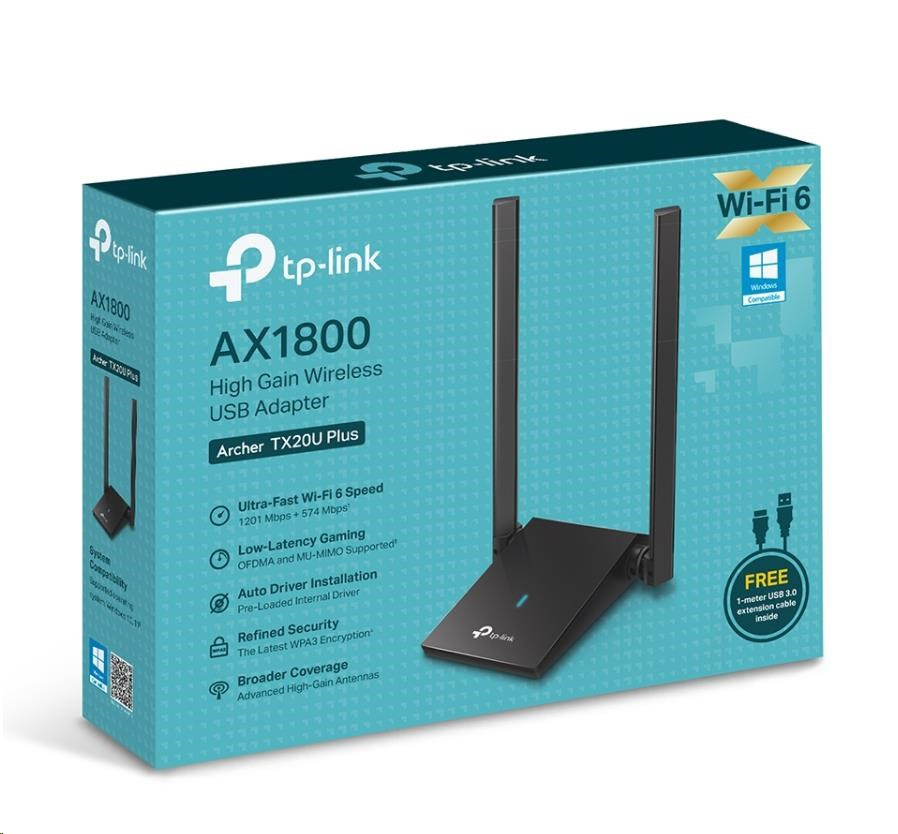 TP-Link Archer TX20U Plus WiFi6 USB adapter (AX1800,2,4GHz/5GHz,USB3.0)Typ aktivního prvku:MU-MIMO, Adaptéry USB; Frekvenční pásmo (GHz):2,4, 5, 2,4 + 5 (Dual Band); Podporované standardy:802.11ax, 802.11b/g, 802.11b/g/n, 802.11a, 802.11b, 802.11a/n, 802.11g, 802.11n, 802.11ac; Zabezpečení:WEP 64bit, WPA, WPA2, WPA-PSK, WPA2-PSK, WPA3; Typ antény:Vestavěná; Použití:Vnitřní.