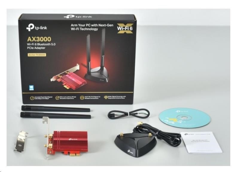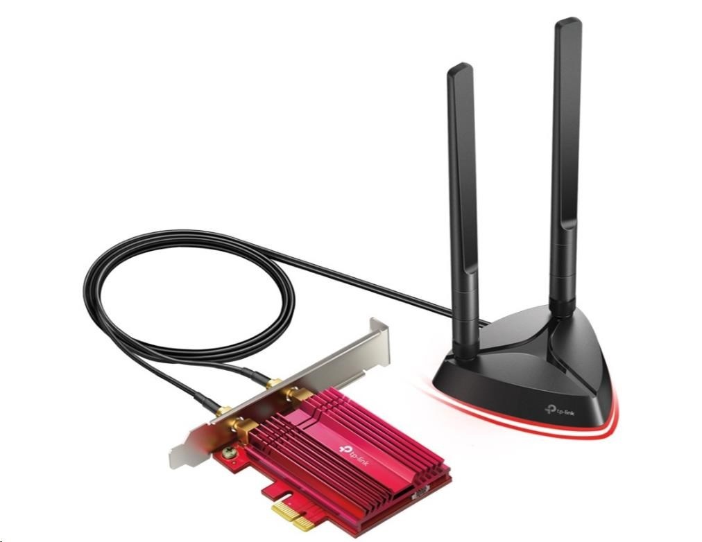 TP-Link Archer TX3000E WiFi6 PCIe adapter (AX3000,2,4GHz/5GHz,Bluetooth5.0)Typ aktivního prvku:MU-MIMO, Adaptéry PCI-E, Adaptéry Bluetooth; Frekvenční pásmo (GHz):2,4, 5, 2,4 + 5 (Dual Band); Podporované standardy:802.11ax, 802.11b/g, 802.11b/g/n, 802.11a, 802.11b, 802.11a/n, 802.11g, 802.11n, 802.11ac; Zabezpečení:WEP 64bit, WEP 128bit, WPA, WPA2, WPA-PSK, WPA2-PSK, WPA3; Typ antény:Odnímatelná; Připojení externí antény.