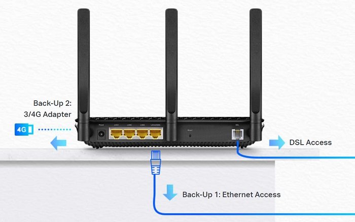 Archer VR2100 je navržen tak, aby vás kdykoliv připojil k internetu. Port Ethernet WAN podporuje kabelové připojení ke kabelovému nebo síťovému modemu. V případě, že selže vaše připojení k internetu, připojte 3G / 4G adaptér k portu USB 3.0, který bude sloužit jako záložní možnost.