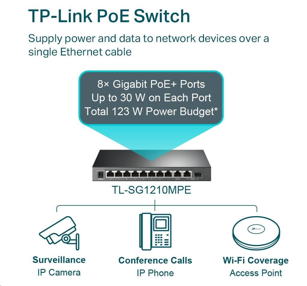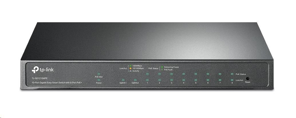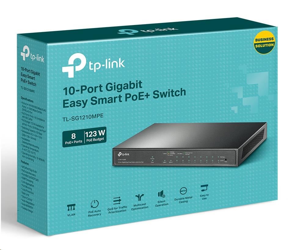 TP-Link CCTV Easy Smart switch TL-SG1210MPE (8xGbE, 1xGbE uplink, 1xGbE/SFP combo uplink, 8xPoE+, 123W, fanless)Provedení:Desktop; Funkce:QoS (Quality of service), VLAN (virtual local area network), PoE (Power over ethernet), L2, Web management/Smart switch; Technologie:Gigabit Ethernet 1000Mbps; Počet portů LAN:8; Počet portů LAN:8; Podporované standardy PoE:802.3af, 802.3at; PoE budget (W):123; Počet portů Combo:1; Počet portů Combo:1; Maximální počet portů:10.