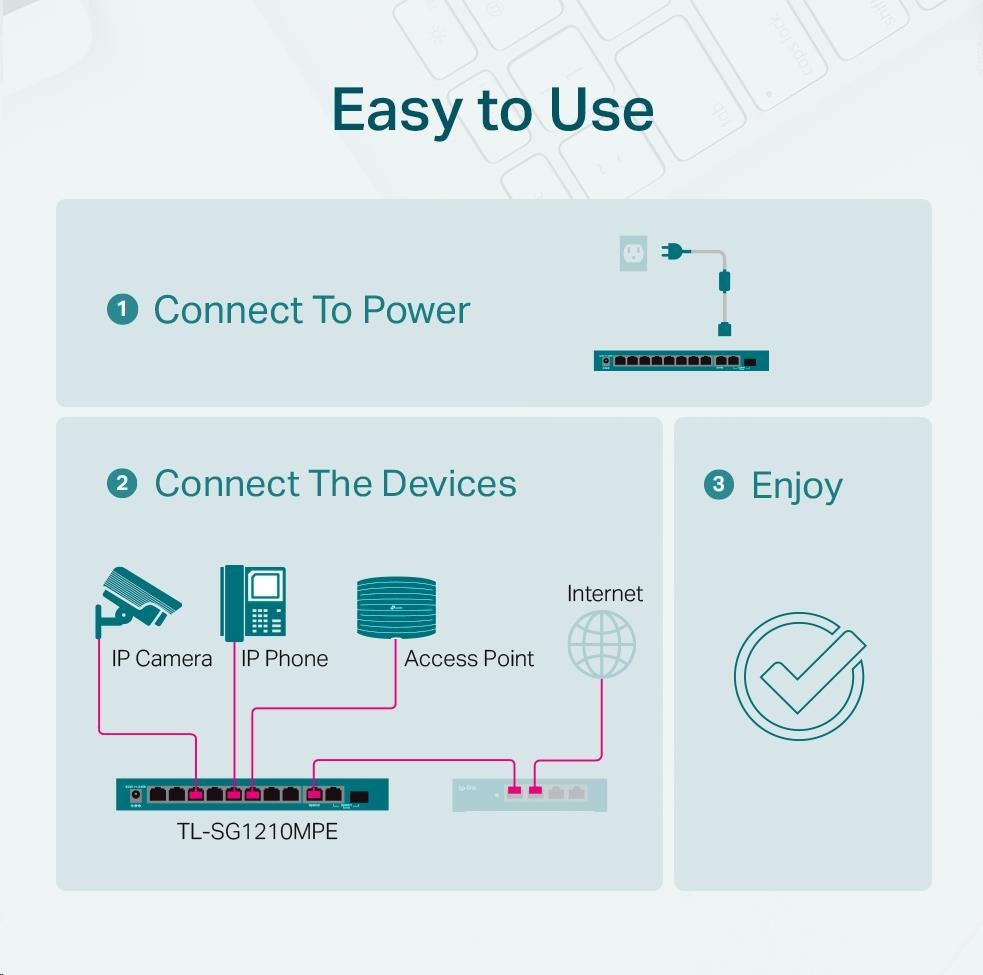 TL-SG1210MPE je plně kompatibilní se zařízeními PoE, jako jsou IP kamery, přístupové body a IP telefony. Lze také použít pro kabelové připojení zařízení bez PoE, jako jsou počítače, tiskárny a IPTV.