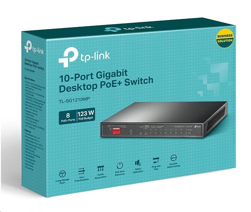 TP-Link CCTV switch TL-SG1210MP (8xGbE, 1xGbE uplink, 1xGbE/SFP combo uplink, 8x PoE+, 123W, fanless)Provedení:Desktop; Funkce:PoE (Power over ethernet); Technologie:Gigabit Ethernet 1000Mbps; Počet portů LAN:8; Počet portů LAN:8; Podporované standardy PoE:802.3af, 802.3at; PoE budget (W):125; Počet portů Combo:1; Počet portů Combo:1; Maximální počet portů:9; Počet PoE+ portů:8; PoE budget (W):125; Přenosová rychlost LAN (Mb/s):1000.