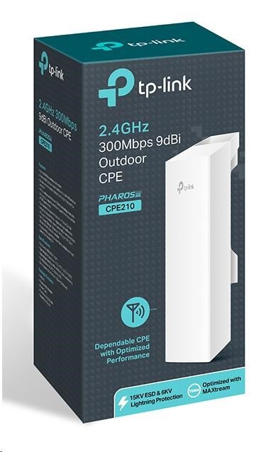 TP-Link CPE210 venkovní CPE (2,4GHz, 300Mb/s, 9dBi, 2x100Mb/s, 1xPoE)Typ aktivního prvku:AP (Access Point), Bridge, Klient, Venkovní jednotky; Frekvenční pásmo (GHz):2,4; Podporované standardy:802.11b/g, 802.11b/g/n, 802.11b, 802.11g, 802.11n; Zabezpečení:WEP 64bit, WEP 128bit, WPA, WPA2, WPA-PSK, WPA2-PSK; Typ antény:Vestavěná; Použití:Venkovní; Typy PoE:PoE - In; Počet portů LAN:2; Počet portů LAN:2.