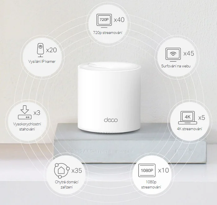 Díky vybavení technologií Wi-Fi 6 je Deco Wi-Fi mesh systém pokrývající celou domácnost navržen k tomu, aby poskytoval výrazné zlepšení v pokrytí, rychlosti a celkové kapacitě. Pořiďte si nejnovější Wi-Fi mesh systém a získejte výhody sítě budoucnosti, která poskytuje vyšší přenosovou rychlost a připojí více zařízení.