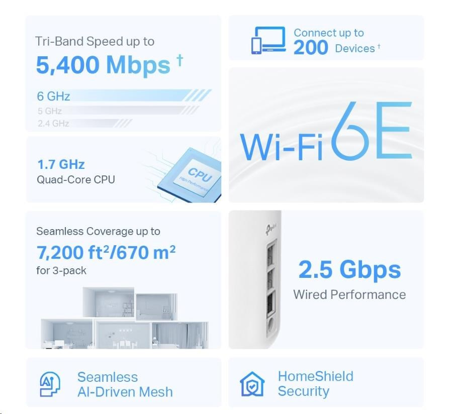 - Třípásmový Wi-Fi 6E Mesh systém (v balení 2 jednotky)