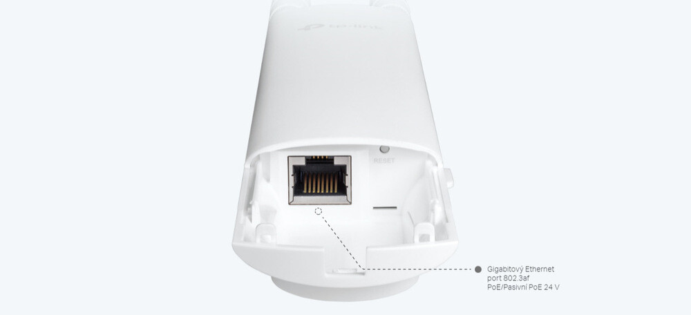 Co se týče konektorové výbavy, přístupový bod TP-Link EAP110 disponuje jedním fast ethernet portem. Díky podpoře pasivního PoE (PoE adaptér je součástí balení) si ušetříte práci s instalací dalších kabelů. Jde totiž o praktickou vychytávku, která spočívá v napájení přes Ethernet.