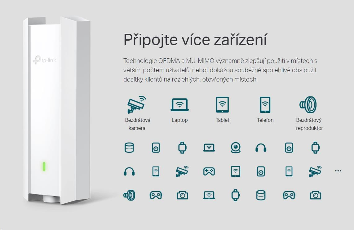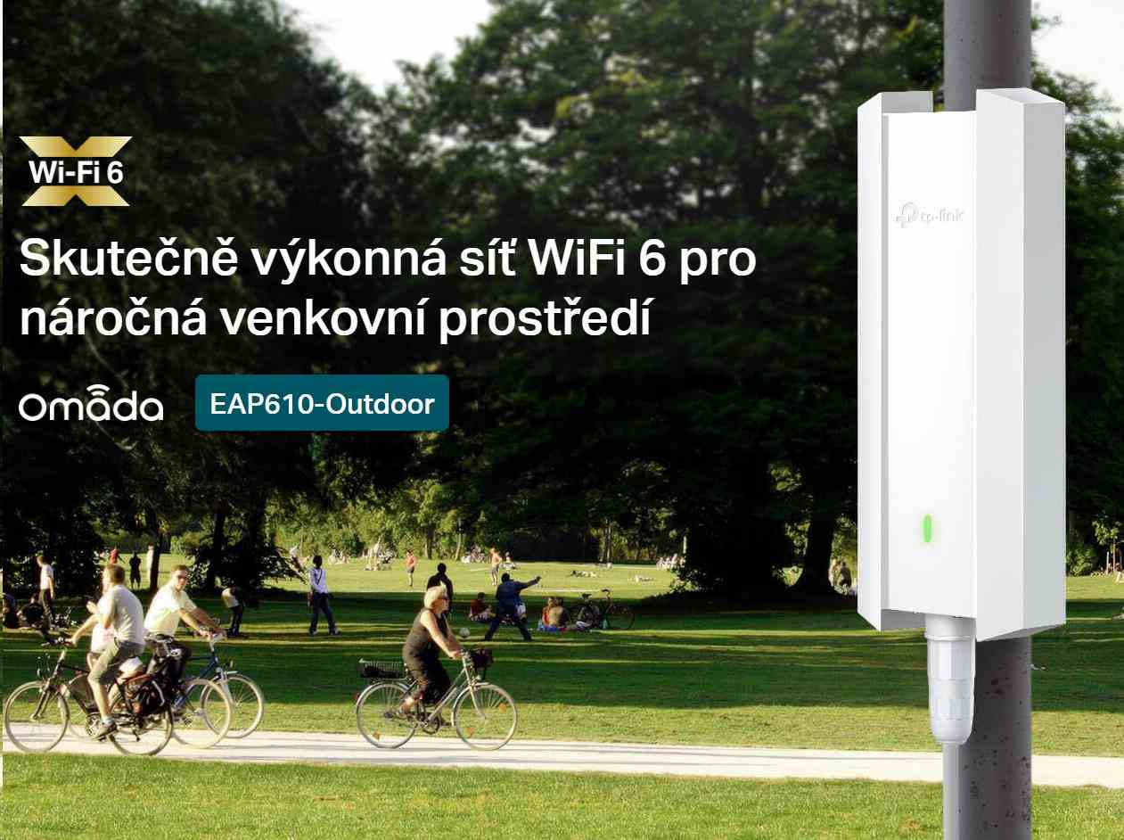TP-Link EAP610-Outdoor-venkovní OMADA WiFi6 AP (AX1800,2,4GHz/5GHz,1xGbELAN,1xPoE-in)Typ aktivního prvku:AP (Access Point), MU-MIMO, Venkovní jednotky; Frekvenční pásmo (GHz):2,4, 5, 2,4 + 5 (Dual Band); Podporované standardy:802.11ax, 802.11b/g, 802.11b/g/n, 802.11a, 802.11b, 802.11g, 802.11a/n, 802.11n, 802.11ac; Zabezpečení:WEP 64bit, WPA-PSK, WPA2-PSK, WPA-Enterprise, WPA2-Enterprise, WPA3; Typ antény:Integrovaná; Použití:Venkovní.