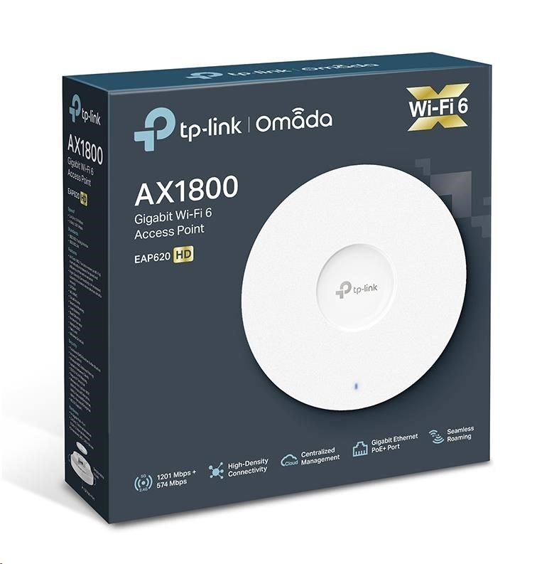 TP-Link EAP620 HD V3.20 OMADA WiFi6 AP (AX1800,2,4GHz/5GHz,1xGbELAN,1xPoE-in)Typ aktivního prvku:AP (Access Point), MU-MIMO; Frekvenční pásmo (GHz):2,4, 5, 2,4 + 5 (Dual Band); Podporované standardy:802.11ax, 802.11b/g, 802.11b/g/n, 802.11b, 802.11a, 802.11a/n, 802.11g, 802.11n, 802.11ac; Zabezpečení:WEP 64bit, WPA-PSK, WPA2-PSK, WPA-Enterprise, WPA2-Enterprise, WPA3; Typ antény:Integrovaná; Použití:Vnitřní; Typy PoE:PoE - In.
