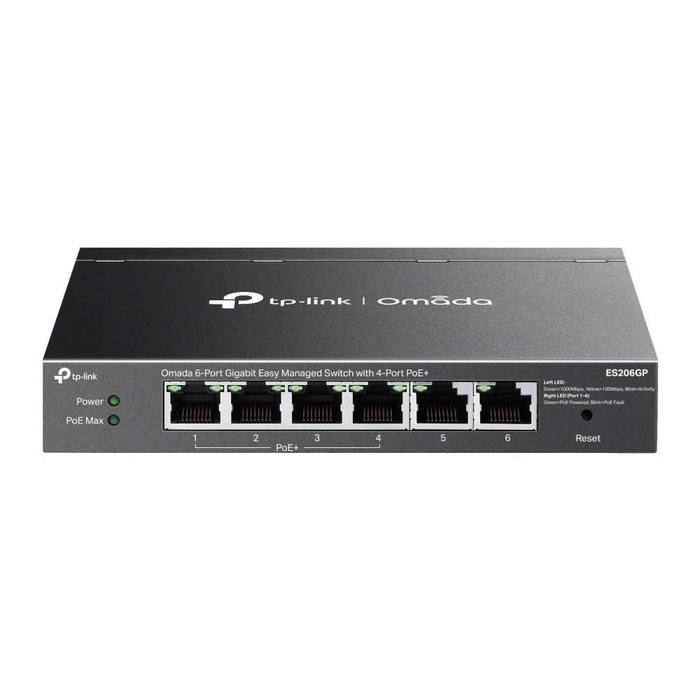TP-Link OMADA switch ES206GP (6xGbE,4xPoE+,65W, fanless)Provedení:Desktop; Funkce:QoS (Quality of service), VLAN (virtual local area network), PoE (Power over ethernet), DHCP snooping, L2, Web management/Smart switch; Technologie:Gigabit Ethernet 1000Mbps; Počet portů LAN:6; Podporované standardy PoE:802.3af, 802.3at; PoE budget (W):65; Maximální počet portů:6; Počet PoE+ portů:4; Management:Web.