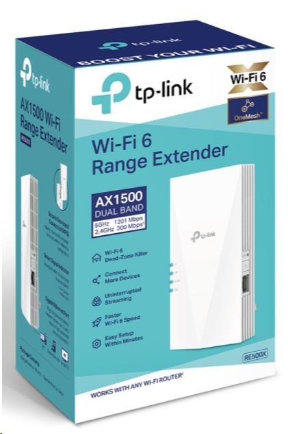 TP-Link RE500X OneMesh/EasyMesh WiFi6 Extender/Repeater (AX1500,2,4GHz/5GHz,1xGbELAN)Typ aktivního prvku:AP (Access Point), Extender, Repeater; Frekvenční pásmo (GHz):2,4, 5, 2,4 + 5 (Dual Band); Podporované standardy:802.11ax, 802.11b/g, 802.11b/g/n, 802.11b, 802.11a, 802.11g, 802.11a/n, 802.11n, 802.11ac; Zabezpečení:WPS, WEP 64bit, WEP 128bit, WPA, WPA2-PSK; Typ antény:Integrovaná; Použití:Vnitřní; Počet portů LAN:1; Počet portů LAN:1.