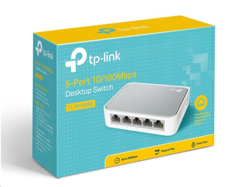 TP-Link switch TL-SF1005D (5x100Mb/s, fanless)Provedení:Desktop; Technologie:Fast Ethernet 10/100Mbps; Počet portů LAN:5; Počet portů LAN:5; Maximální počet portů:5; Přenosová rychlost LAN (Mb/s):100; Maximální počet portů:5.