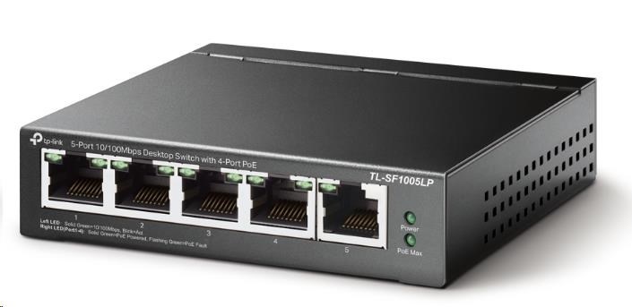 TP-Link switch TL-SF1005LP (5x100Mb/s, 4xPoE, 41W, fanless)Provedení:Desktop; Funkce:PoE (Power over ethernet); Technologie:Fast Ethernet 10/100Mbps; Počet portů LAN:5; Počet portů LAN:5; Podporované standardy PoE:802.3af; PoE budget (W):41; Počet PoE Out portů:4; Počet PoE Out portů:4; Maximální počet portů:5; PoE budget (W):41; Přenosová rychlost LAN (Mb/s):100; Maximální počet portů:5.
