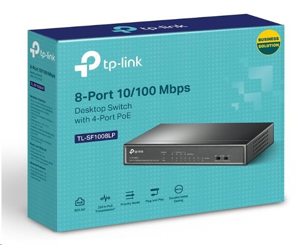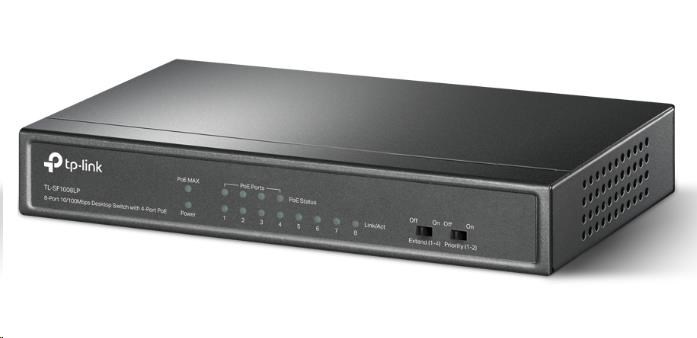 TP-Link switch TL-SF1008LP (8x100Mb/s, 4xPoE, 41W, fanless)Provedení:Desktop; Funkce:PoE (Power over ethernet); Technologie:Fast Ethernet 10/100Mbps; Počet portů LAN:8; Podporované standardy PoE:802.3af; Počet PoE Out portů:4; PoE budget (W):41; Přenosová rychlost LAN (Mb/s):100; Maximální počet portů:8; Vlastnosti switche:Funkce POE po portech.
