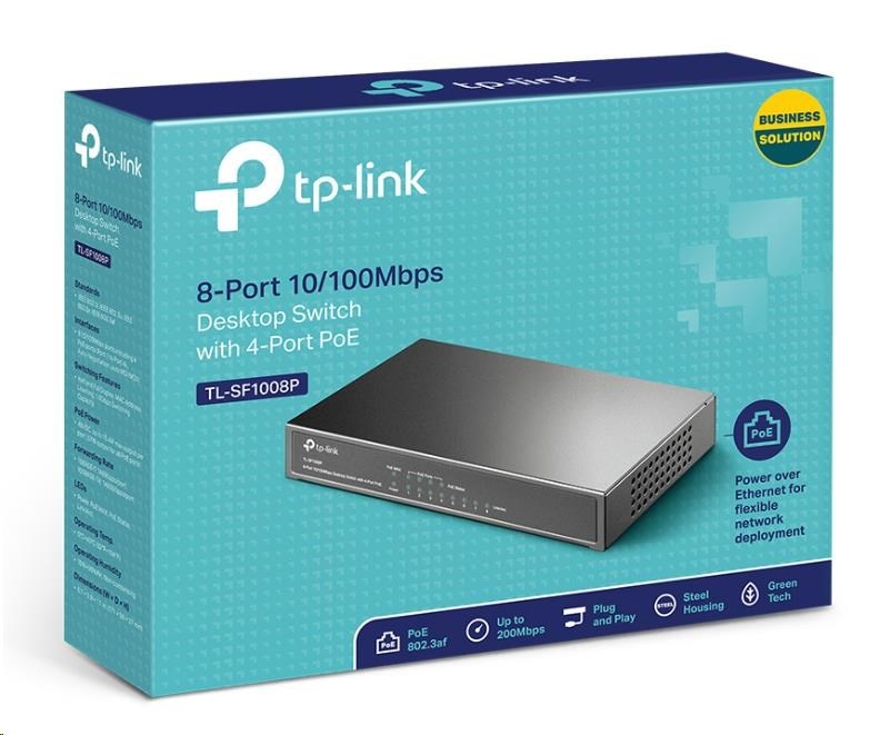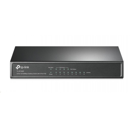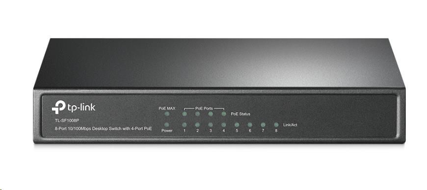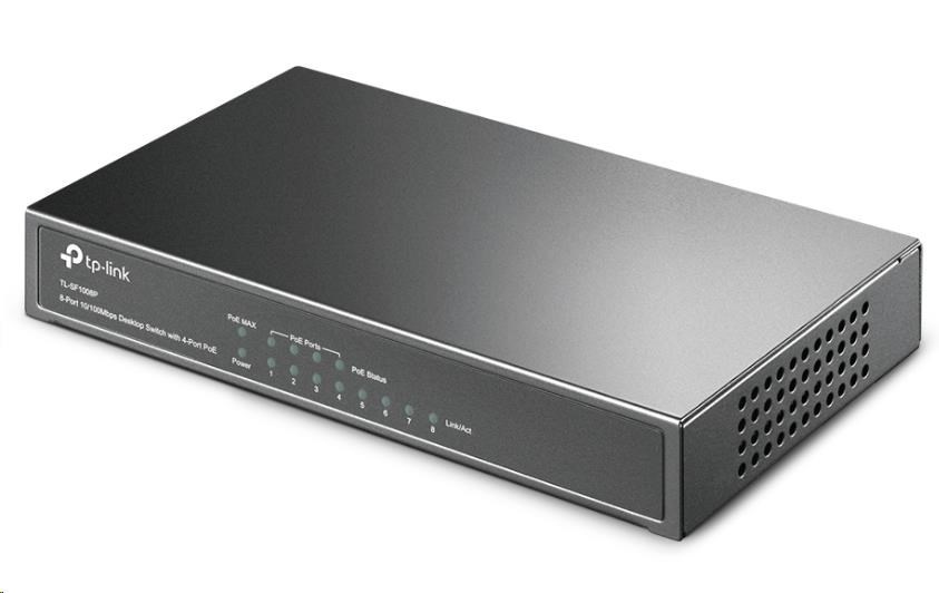 TP-Link switch TL-SF1008P (8x100Mb/s, 4xPoE+, 66W, fanless)Provedení:Desktop; Funkce:PoE (Power over ethernet); Technologie:Fast Ethernet 10/100Mbps; Počet portů LAN:8; Počet portů LAN:8; Podporované standardy PoE:802.3af, 802.3at; PoE budget (W):66; Maximální počet portů:8; Počet PoE+ portů:4; Přenosová rychlost LAN (Mb/s):100; Maximální počet portů:8; Počet PoE+ portů:4; Vlastnosti switche:Funkce POE po portech.
