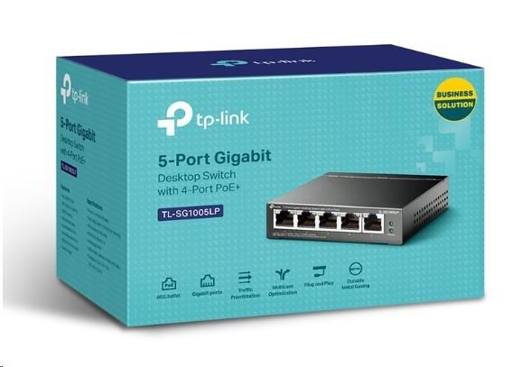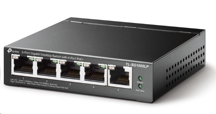 TP-Link switch TL-SG1005LP (5xGbE, 4xPoE+, 40W, fanless)Provedení:Desktop; Funkce:QoS (Quality of service), PoE (Power over ethernet); Technologie:Gigabit Ethernet 1000Mbps; Počet portů LAN:5; Počet portů LAN:5; Podporované standardy PoE:802.3af, 802.3at; PoE budget (W):40; Maximální počet portů:5; Počet PoE+ portů:4; PoE budget (W):40; Přenosová rychlost LAN (Mb/s):1000; Maximální počet portů:5.