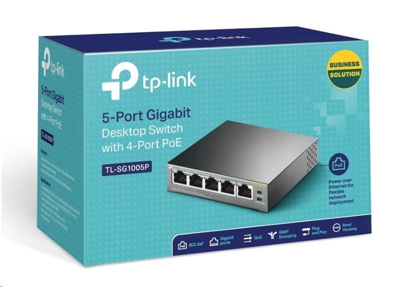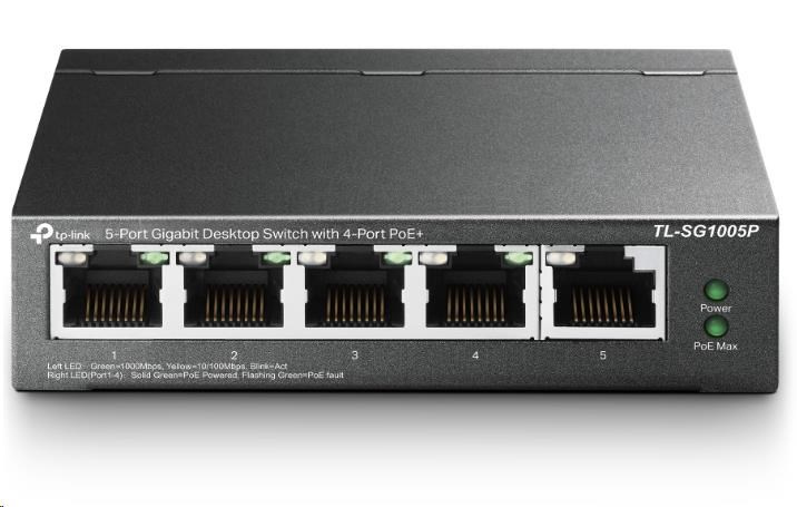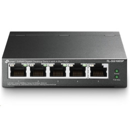 TP-Link switch TL-SG1005P (5xGbE, 4xPoE+, 65W, fanless)Provedení:Desktop; Funkce:QoS (Quality of service), PoE (Power over ethernet); Technologie:Gigabit Ethernet 1000Mbps; Počet portů LAN:5; Počet portů LAN:5; Podporované standardy PoE:802.3af, 802.3at; PoE budget (W):65; Maximální počet portů:5; Počet PoE+ portů:4; PoE budget (W):65; Přenosová rychlost LAN (Mb/s):1000; Maximální počet portů:5.