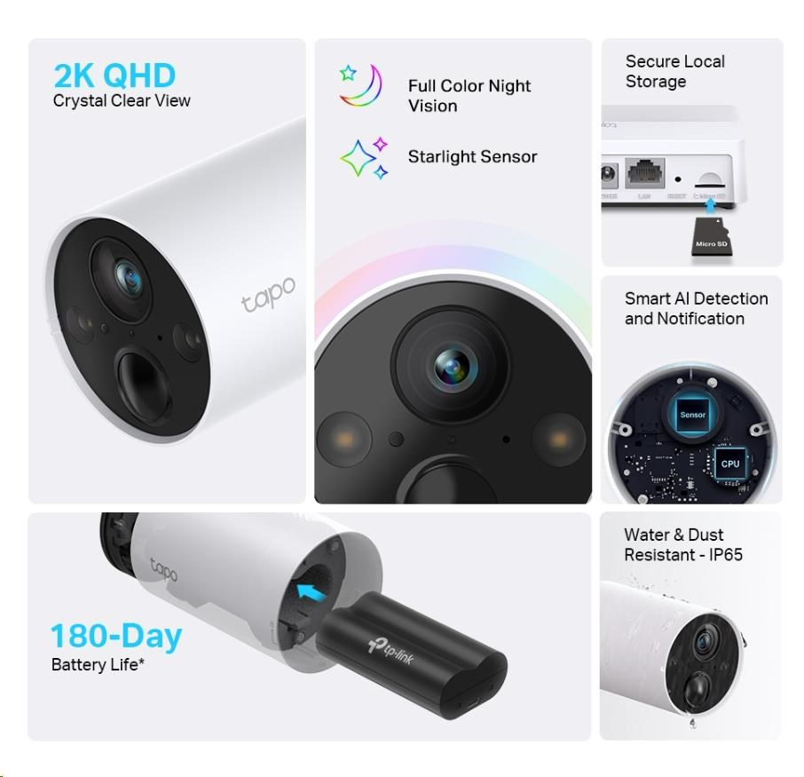 Výdrž baterie až 180 dní vychází z laboratorního testování společnosti TP-Link při spuštění 10–20 událostí denně. Skutečná výdrž baterie se může lišit podle nastavení a způsobu používání zařízení a faktorů okolního prostředí.