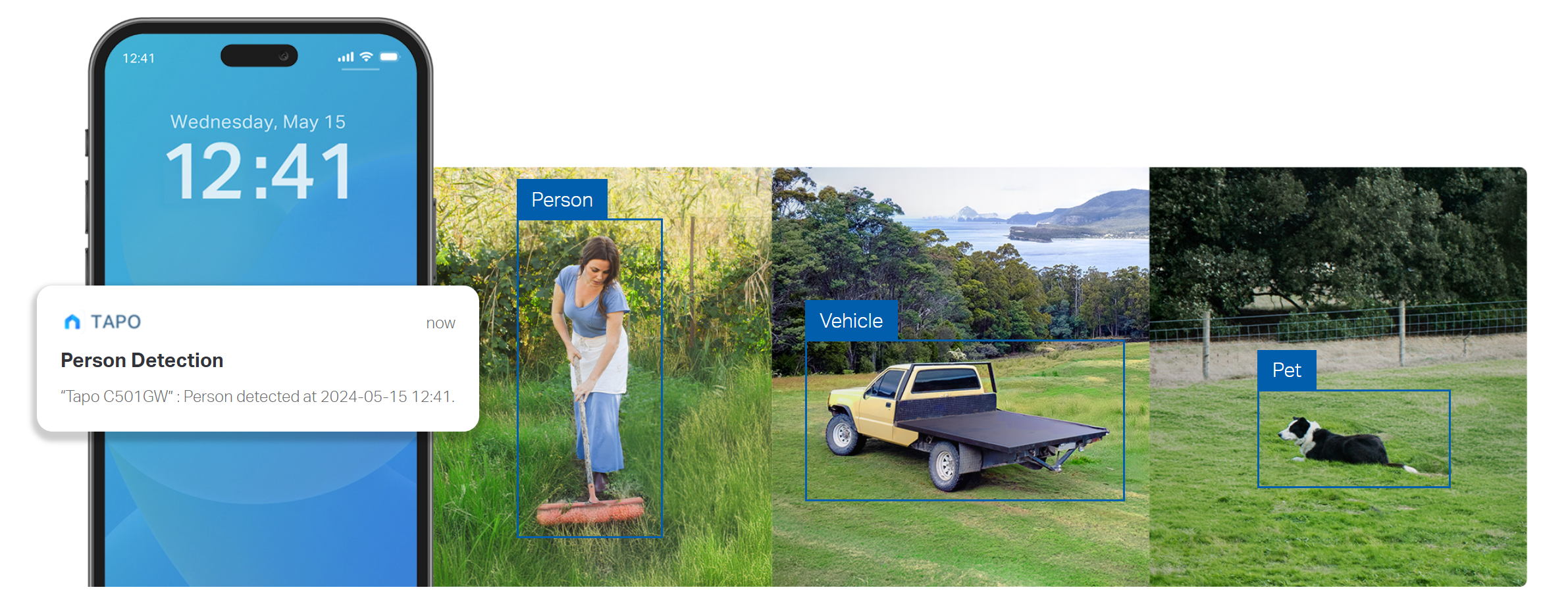 Bezpečnostní kamera TP-Link Tapo C501GW disponuje pokročilou AI detekcí, která rozpozná osoby, zvířata či vozidla a následně odešle upozornění.