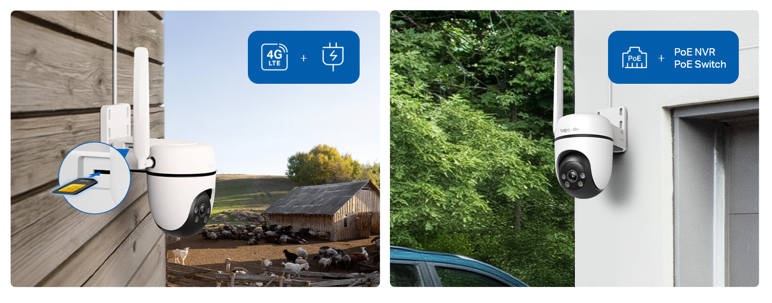 IP kameru TP-Link Tapo C501GW můžete napájet DC adaptérem a připojit k internetu pomocí 4G SIM karty. Druhou možností je napájení kamery pomocí ethernetového kabelu s technologií PoE, což je ideální řešení pro bezpečné napájení a stabilní internet.