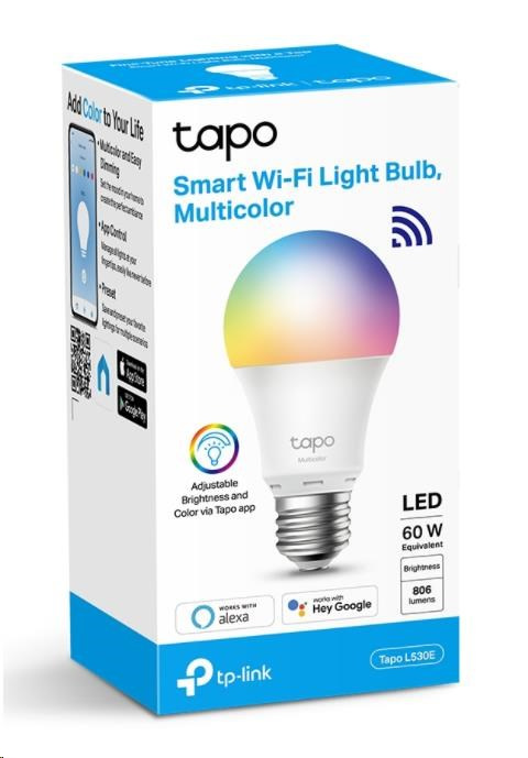 Chytrá Wi-Fi žárovka, vícebarevná. Až 16 milionů barev. Možnost stmívání. Plány a časovače. Pohodlné hlasové ovládání. Režim V nepřítomnosti. Snadné nastavení. Není vyžadován žádný rozbočovač. Úspora energie. Bezplatná aplikace Tapo. Patice E27.