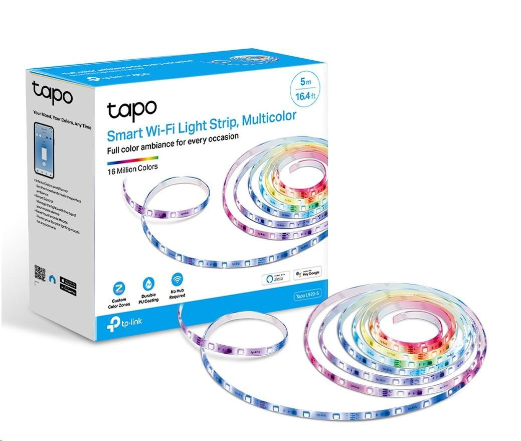 TP-Link Tapo L920-5 chytrý WiFi LED pásek (barevný,2,4GHz, 5m)Produkt:Žárovka; Typ světelného zdroje:LED pásek; Příslušenství:Ovladač; Napětí (V):230; Příkon:21; Životnost:25000 hodin; Počet kusů v balení:1; Funkce:Nastavení barvy, Stmívatelnost; Typ svítidla:Dekorativní; Kompatibilita:Google assistant, Amazon Alexa, WiFi.