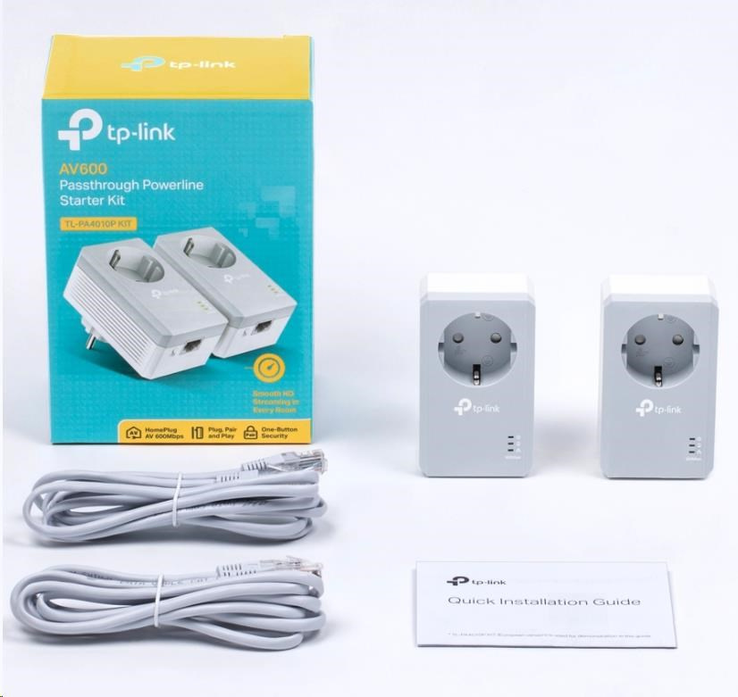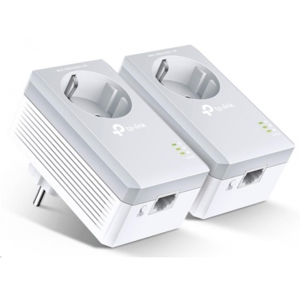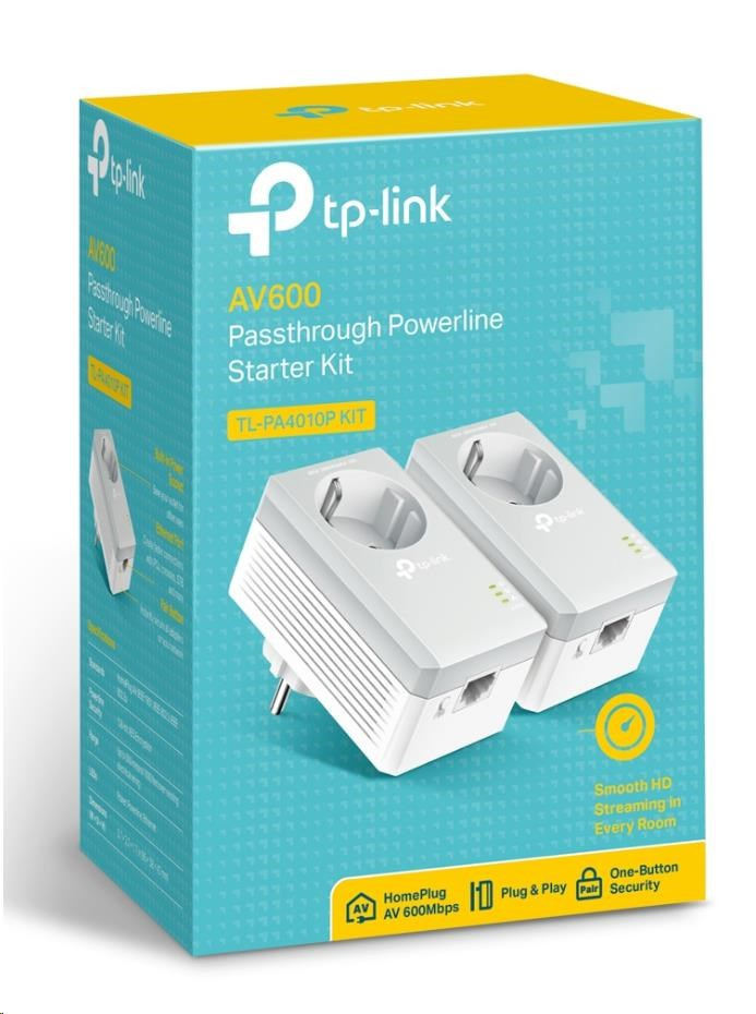 TP-Link TL-PA4010PKIT průchozí powerline set (AV600, 1x100Mb/s, HomePlug AV)Sada adaptérů AV600 Powerline Starter Kit s podporou napájení (AC).