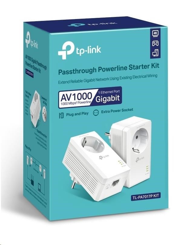 TP-Link TL-PA7017PKIT průchozí powerline set (AV1000,1xGbE, HomePlug AV2)AV1000 gigabitová průchozí Powerline sada.