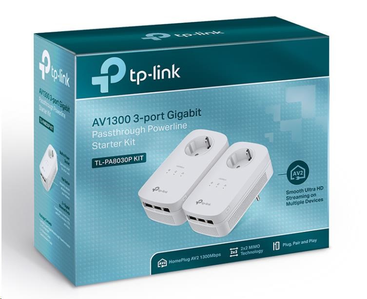 TP-Link TL-PA8030PKIT průchozí powerline set (AV1300,3xGbE, HomePlug AV2)Sada AV1300 Powerline Starter se třemi gigabitovými porty.