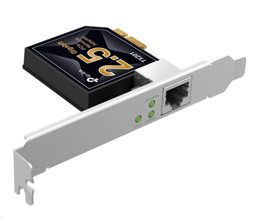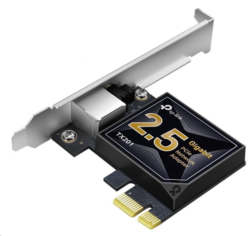 TP-Link TX201 PCIe adapter (1xPCIe2.1,1x2,5GbE)Provedení:Interní; Rozhraní:PCIe; Přenosová technologie LAN:Ethernet 10/100/1000/2500; Počet portů LAN:1; Přenosová rychlost LAN (Mb/s):2500.