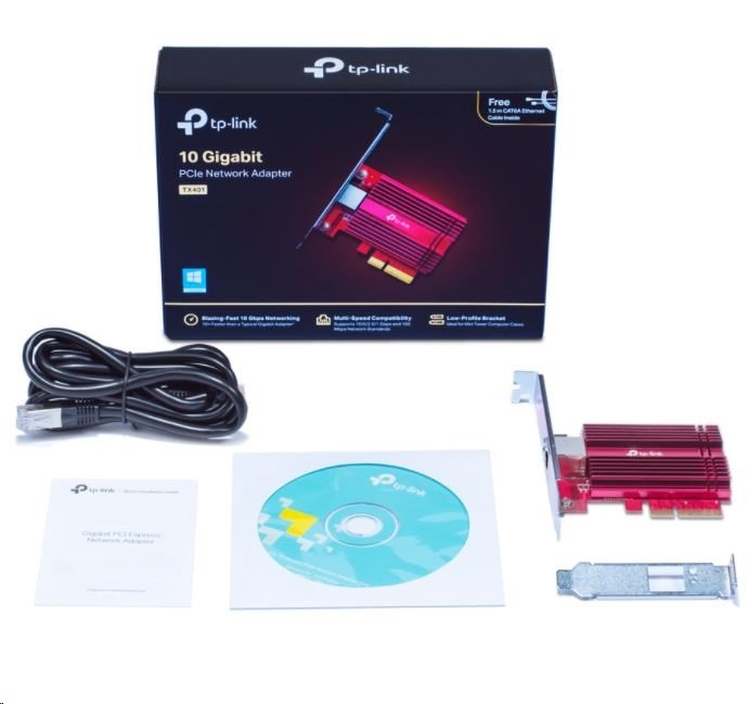 TP-Link TX401 PCIe adapter (1xPCIe3.0,1x10GbE)Provedení:Interní; Rozhraní:PCIe; Frekvenční pásmo (GHz):2,4, 5; Přenosová technologie LAN:Ethernet 10G; Počet portů LAN:1; Počet portů LAN:1; Přenosová rychlost LAN (Mb/s):10000; Přenosová rychlost LAN (Mb/s):10000.