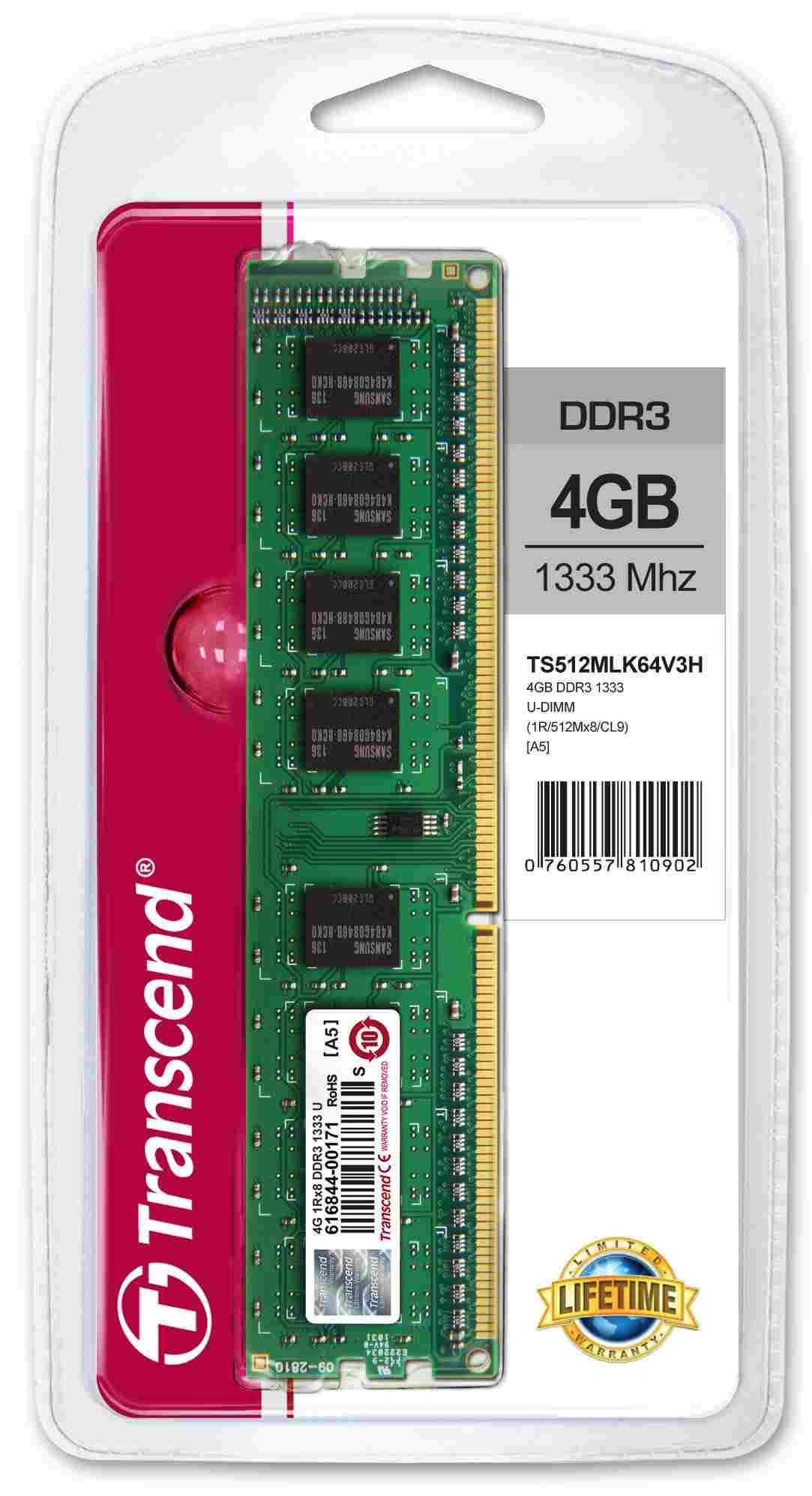TRANSCEND DIMM DDR3 4GB 1333MHz 1Rx8 CL9Využití paměti:PC; Technologie paměti RAM:DDR3; Velikost paměti RAM (GB):4; Frekvence paměti RAM (GHz):1.333; Časování CAS:9; Chlazení:Bez chladiče.