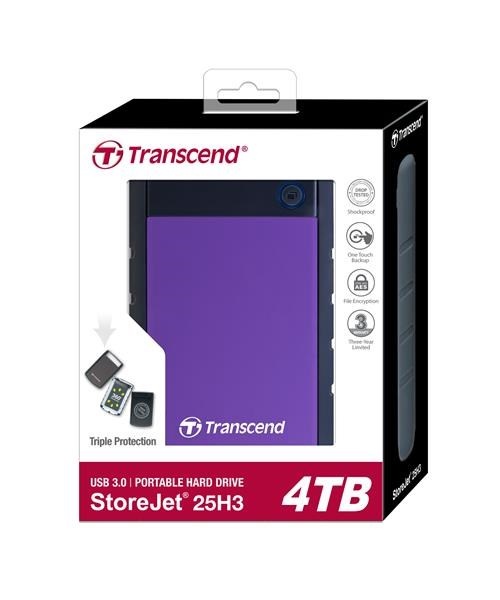 Kód: 325602Prodejní číslo: TS4TSJ25H3PTRANSCEND externí HDD USB 3.1 StoreJet 25H3P, 4TB, Purple (nárazuvzdorný)