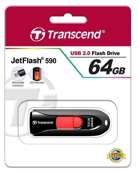 TRANSCEND Flash Disk 64GB JetFlash®590K, USB 2.0 (R:16/W:6 MB/s) černáKapacita uložiště:64 GB; Verze USB:2.0.