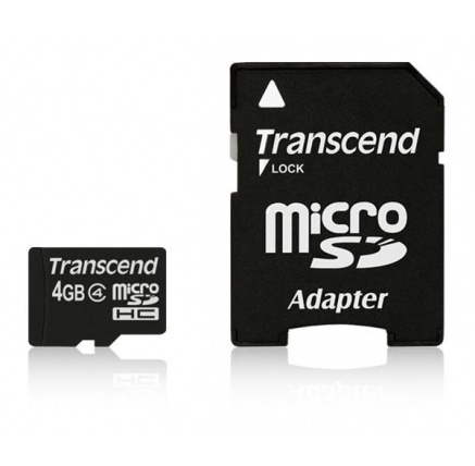 TRANSCEND MicroSDHC karta 4GB Class 4 + adaptérTyp karty:Micro SDHC; Kapacita uložiště:4 GB; Rychlostní kategorie:Class 4; Adaptér; Typické použití:Běžné použití.