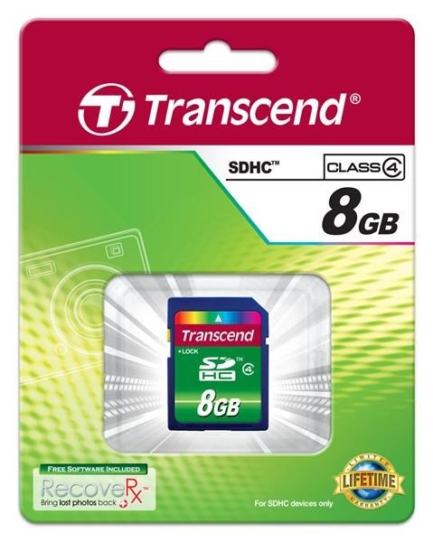 TRANSCEND SDHC karta 8GB Class 4Typ karty:SDHC; Kapacita uložiště:8 GB; Rychlostní kategorie:Class 4; Typické použití:Běžné použití.
