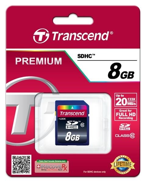 TRANSCEND SDHC karta 8GB Premium, Class 10Typ karty:SDHC; Kapacita uložiště:8 GB; Rychlost čtení min. (MB/s):20; Rychlost zápisu min. (MB/s):20; Rychlostní kategorie:Class 10; Typické použití:Běžné použití.