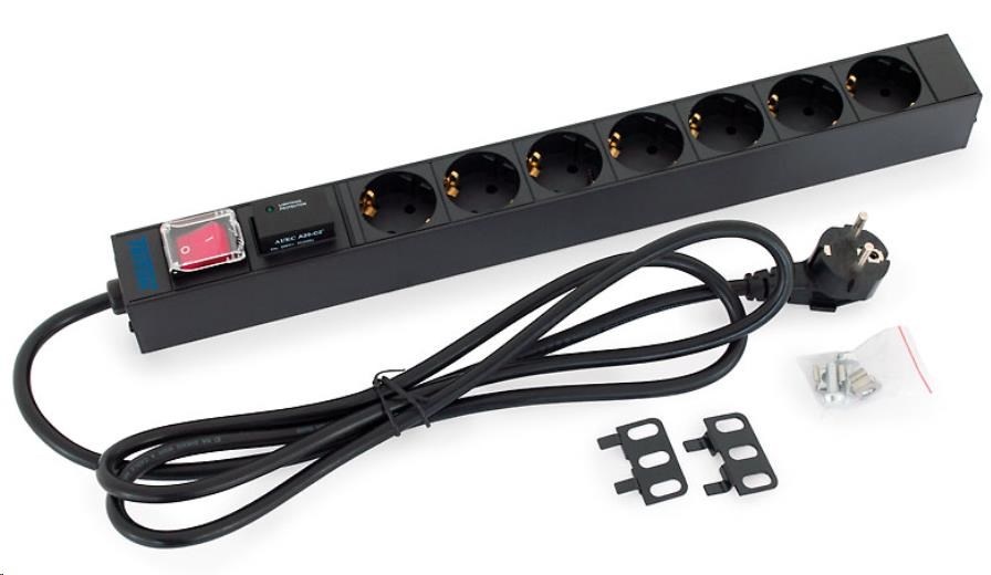 19“ rozvodný panel 1U; 7 x zásuvka podle DIN, max. 16 A; kabel 3 x 1,5 mm, 2 m + zástrčka univerzál CZ-DE max. 16 A; bleskojistka; podsvícený vypínač s bezpečnostním krytem; RAL 9005