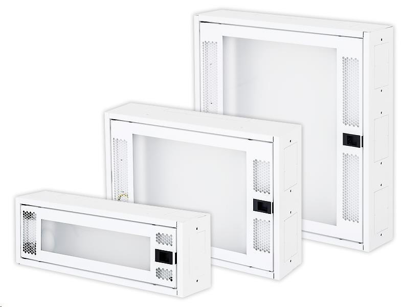 Datový modul hybridních rozvaděčů pro domovní rozvody. IP20 / IK05 Datový rozvaděč RNA je navržen pro zakončení všech domovních kabelových rozvodů a pro instalaci aktivních prvků.Je možno zde propojit Internet, televizní a satelitní rozvody, audio stejně jako klasické telefonní a ADSL spoje.Plastová výplň dveří a celá konstrukce podporují instalaci WiFi zařízení. Kabelové vstupy na horní, spodní a obou bočních stěnách rozvaděče umožňují jeho spojování do větších sestav s ostatními rozvaděči této řady včetně elektro rozvaděčů. Dveře rozvaděče jsou vystouplé směrem dopředu pro zajištění potřebného poloměru ohybu kabelů a to včetně optických. Perforace po stranách napomáhá chlazení instalovaných aktivních prvků. Montáž vybavení pomocí samořezných vrutů na vnitřní plastovou desku je rychlá a snadná. Rozvaděče jsou dodávány v modulární výšce, kde jeden modul zabírá 166 mm. V těchto modulech jsou i elektro rozvaděče této řady. Šířka i hloubka korpusu je jednotná pro všechny výšky. Rozvaděč je univerzální pro montáž na omítku nebo pro zazdění do zdi. Pro montáž do zdi je k dispozici krycí rámeček. Díky modularitě je možné použít např. 2 moduly vysokou datovou část a 1 modul elektro, vše pak zakryto 3 modulovým rámečkem. VÝKLOPNÉ BOČNÍ PANELY Boční nosné panely na obou stranách rozvaděče jsou odklopitelné pro snadnou montáž osazovaných komponent. Všechny oddělitelné nebo pohyblivé části jsou pospojeny dle normy. DATOVÉ ROZVODY Pro instalaci datových a komunikačních rozvodů jsou připraveny Keystone Standard nosiče, do kterých snadno zakončíte libovolné kabely. NAPÁJENÍ Na protější straně od datových rozvodů je příprava pro osazení napájecí soustavy 230 V. Podle velikosti rozvaděče je zde připraven otvor pro montáž klasické zásuvky (s ochrannou plastovou krabičkou) a/nebo 10“ 1U montážní otvor rozšířený o možnost instalace až 3 běžných zásuvek..