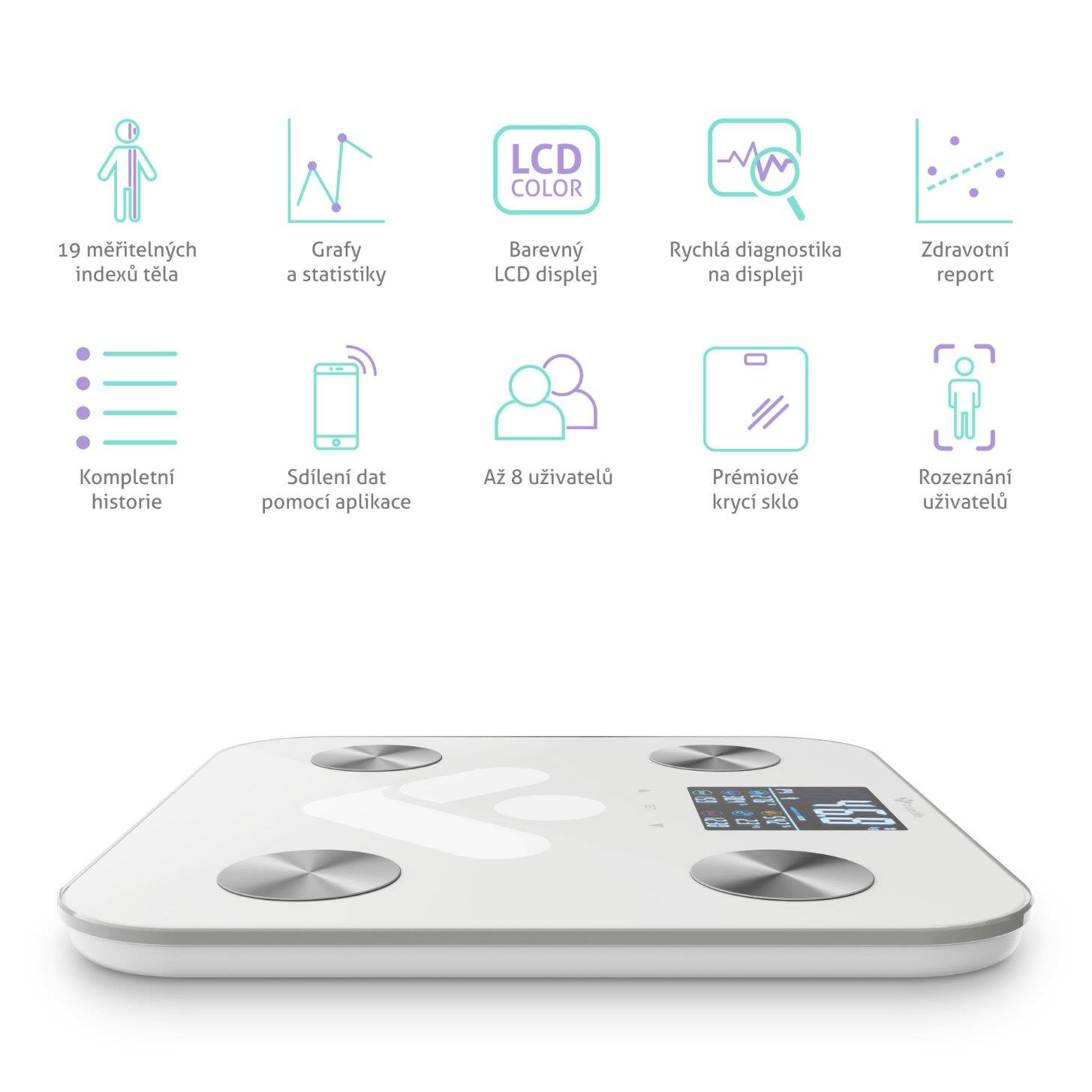 TrueLife FitScale W6 BT automaticky rozezná až 8 uživatelů, takže se s rodinou nebo přáteli můžete předhánět, kdo dosáhne lepších výsledků. Mnohem lépe to jde s mobilní aplikací, kterou si stáhnete kompletně v češtině a během chvíle znáte svůj kompletní reporting, údaje si porovnáte, projdete si statistiky a nastudujete popisy měřených indexů. Data pak můžete sdílet s aplikacemi Apple Health Kit, Fitbit a Google Fit. Dokonalá je rovněž možnost nastavení váhy pro vážení dětí a možnost nastavení notifikací a připomínek vážení.
