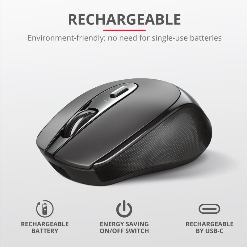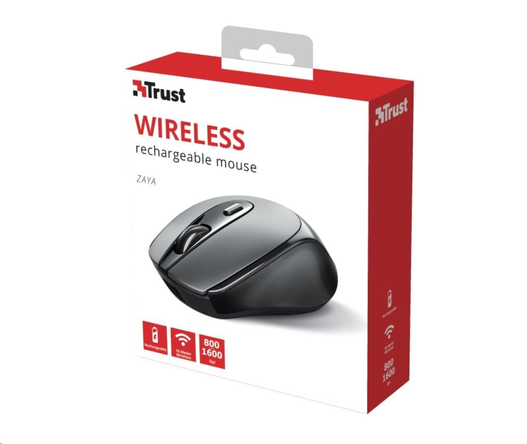 TRUST bezdrátová Myš Zaya Rechargeable Wireless Mouse - blackRozhraní myši:Bezdrátová Wi-Fi; Druh myši:Optická; Specifikace myši:4 a více tlačítek, S kolečkem.